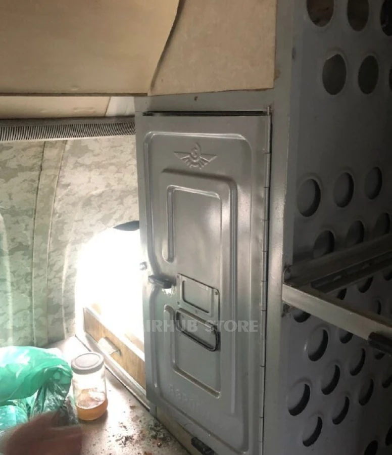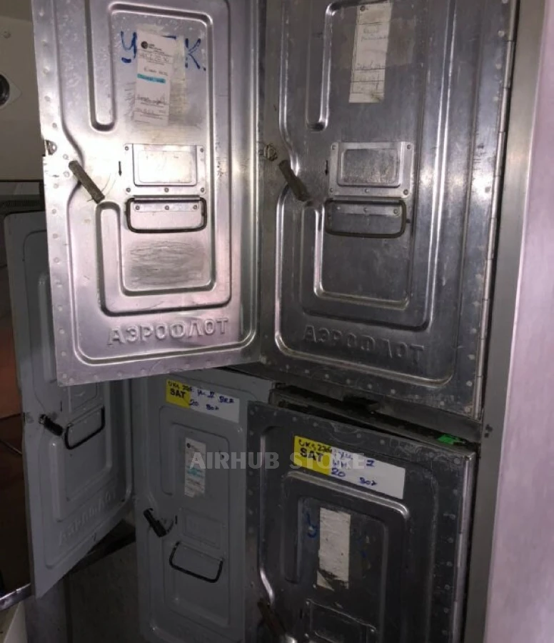 Контейнер изготовлен из алюминия, имеет массивную конструкцию, ручки для переноски и фиксаторы дверец. Следы эксплуатации - царапины, потертости, мелкие пятна - являются аутентичными и подтверждают реальное использование на борту.