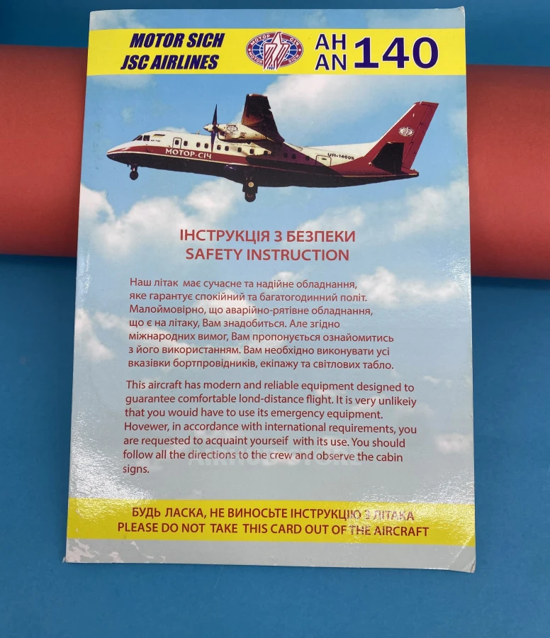 Такие карточки размещались в карманах сидений пассажиров на самолетах Ан-24, Ан-74, Ан-140 и Як-40. Каждая инструкция содержит двуязычный текст (на украинском и английском языках). Это не копии, а оригинальные экземпляры, побывавшие на борту настоящих авиалайнеров, выполняющих рейсы по Украине и за ее пределами.