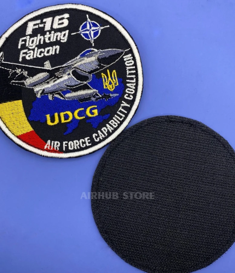 На нашивке изображен легендарный истребитель F-16. UDCG - это альянс из 57 стран (32 государства-члена НАТО и 25 других стран) и стран Европейского Союза, который поддерживает обороноспособность Украины, отправляя военную технику (в частности F-16) в ответ на российское вторжение 2022 года. Спасибо Бельгии за то, что согласовали передачу F-16 в Украину!