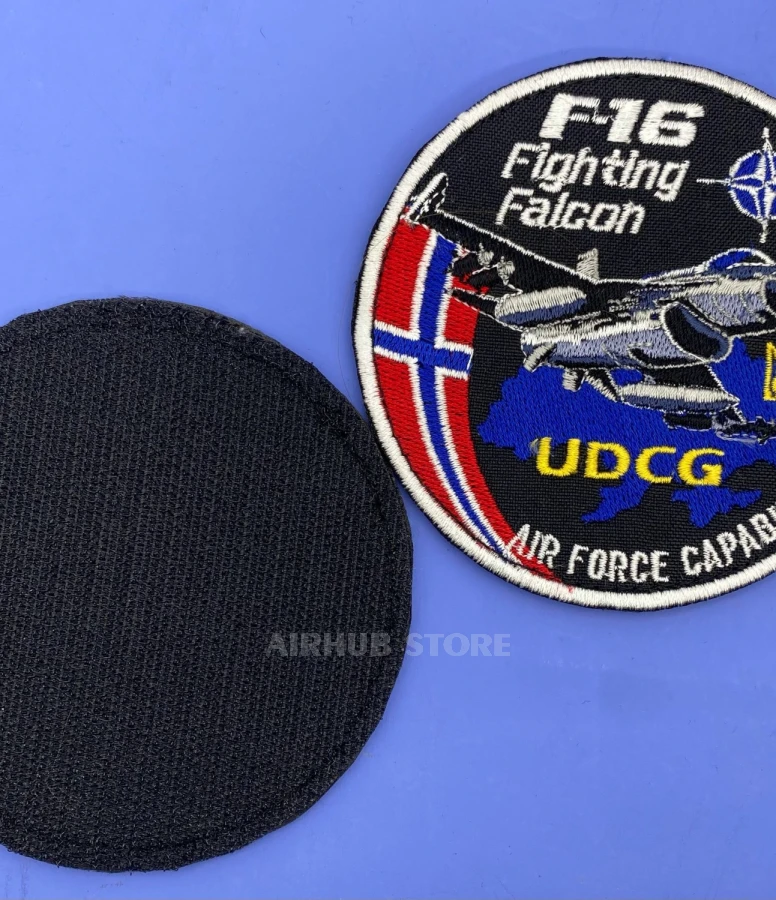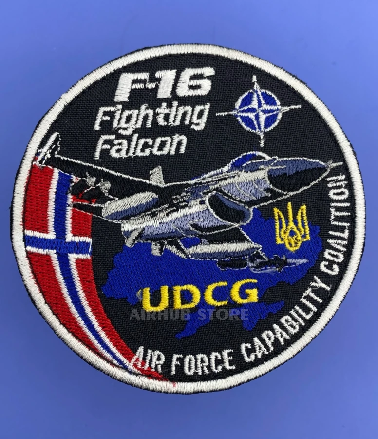 На нашивке изображен легендарный истребитель F-16. UDCG - это альянс из 57 стран (32 государства-члена НАТО и 25 других стран) и стран Европейского Союза, который поддерживает обороноспособность Украины, отправляя военную технику (в частности F-16) в ответ на российское вторжение 2022 года. Спасибо Королевству Норвегия за то, что согласовали передачу F-16 в Украину!