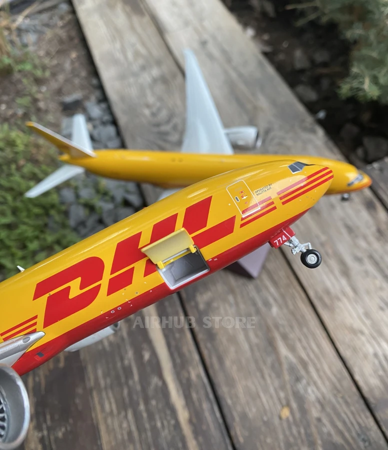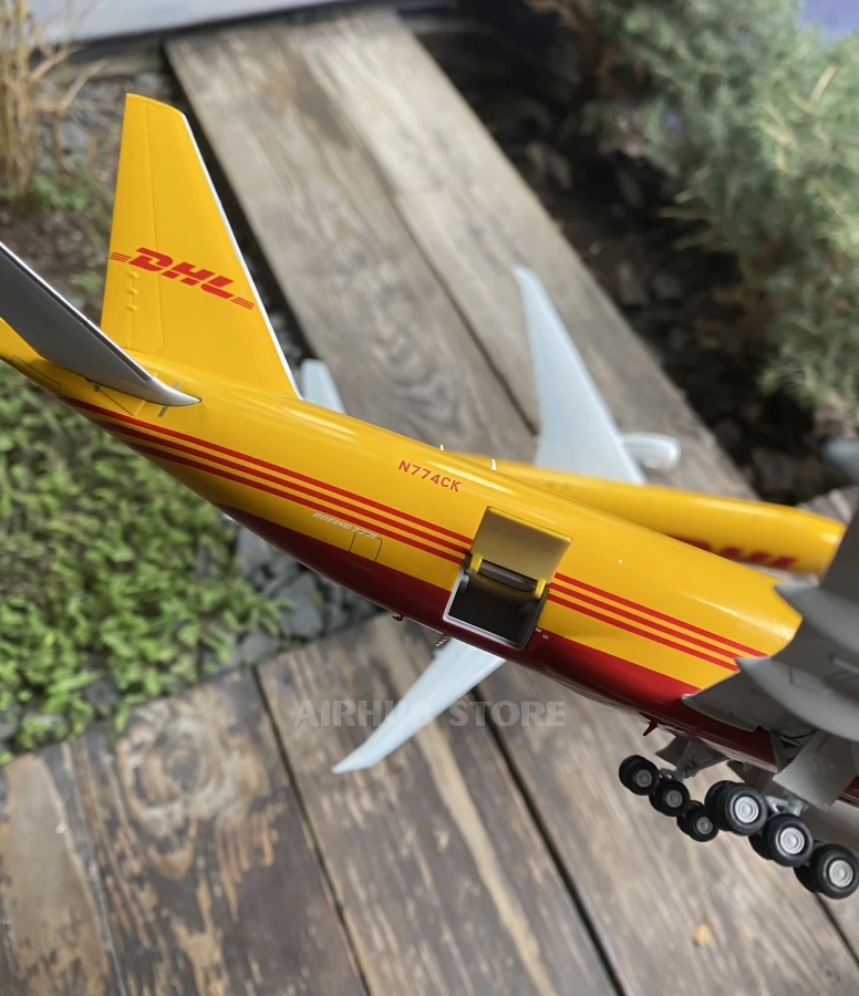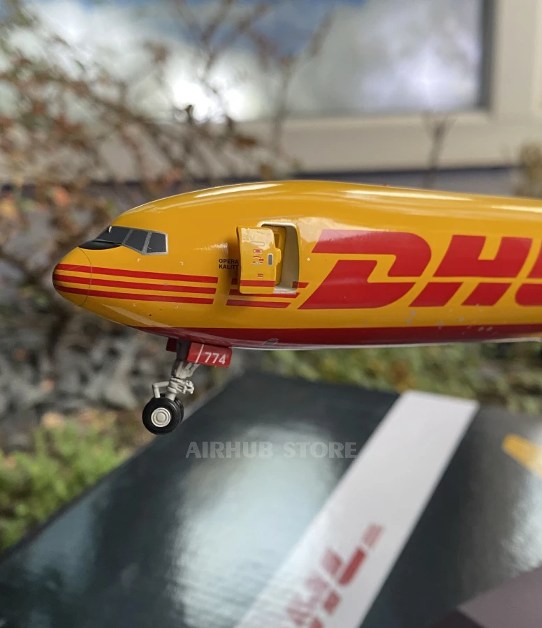 Яскрава ліврея DHL відтворена з високою точністю: кольори, лінії, реєстрація N774CK і дрібні технічні маркування виглядають як на справжньому борту. Міцна підставка забезпечує стабільний показ моделі, а великий масштаб робить її дуже ефектною у колекції.