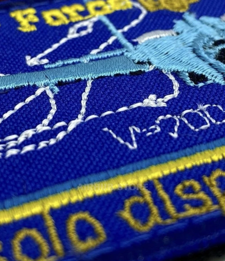 На нашивці вишитий французький винищувач із синьо-жовтими розпізнавальними знаками та бойовим озброєнням, а по колу нанесено напис Ukrainian Air Force. Такий дизайн поєднує сучасну авіацію з українським контекстом, підкреслюючи підтримку повітряного флоту в умовах війни.