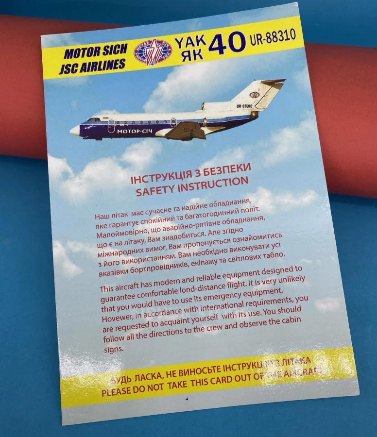 Оригінальні інструкції з безпеки авіакомпанії Мотор Січ для літаків Ан-24, Ан-74, Ан-140 та Як-40. Справжні бортові картки, що використовувались у пасажирських салонах. Рідкісний колекційний предмет української авіації.