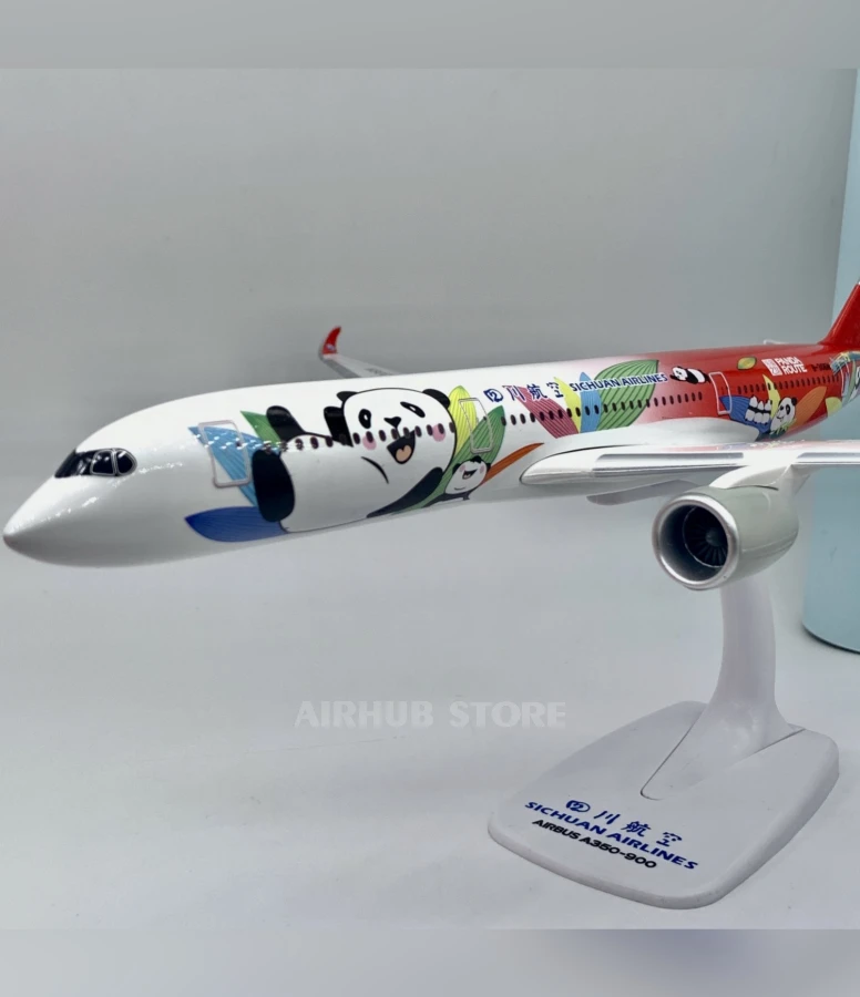 The real Airbus A350-900 is a wide-body airplane known for its efficiency and comfort that Sichuan Airlines uses on various domestic and international routes. The airline, based in Chengdu, China, launched the “Panda Route” in 2018 to offer a unique flying experience inspired by giant pandas. According to simpleflying.com, airplanes with the “Panda Route” livery are decorated with cartoon images of pandas, and the interiors include panda-themed items such as pillows and food, making the flight especially memorable.