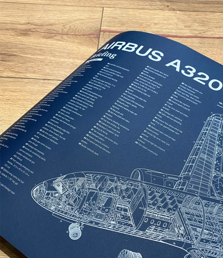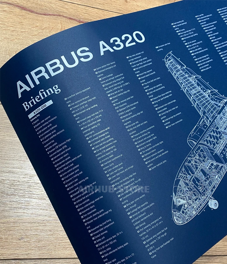 A poster with a drawing of the Airbus A320 airplane, a dark blue poster shows the layout of this aircraft. All the elements are numbered and described around the image, with a decoding and description. The poster itself is printed on thick blue paper, measuring 61 cm by 33 cm.