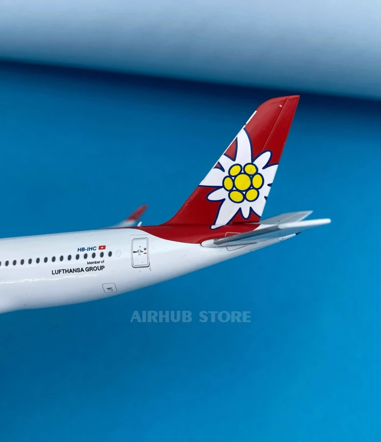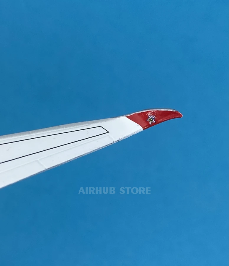 The livery looks particularly impressive: the contrast of red and white, intense blue accents, and a large edelweiss on the nose make the model one of the most photogenic among long-haul airliners.