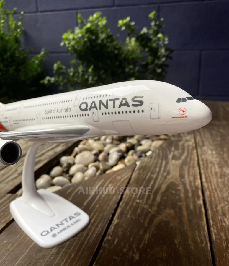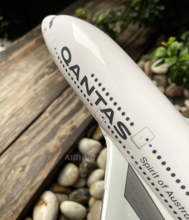 The Airbus A380 is a true giant of the skies, and this 1:200 scale model allows you to appreciate its grandeur. This model features the livery of Qantas, Australia's national carrier, which used the A380 for its longest routes, including between Sydney and London. The registration number VH-OQF corresponds to one of the real aircraft in the company's fleet.