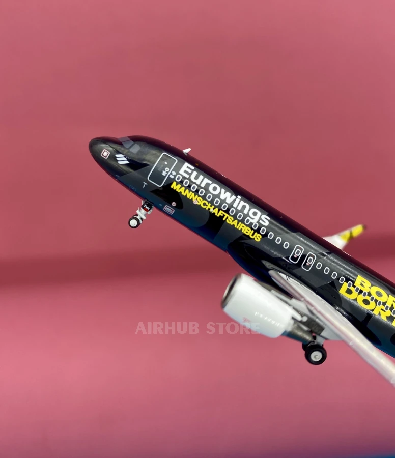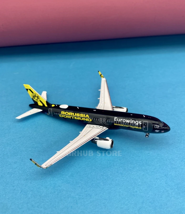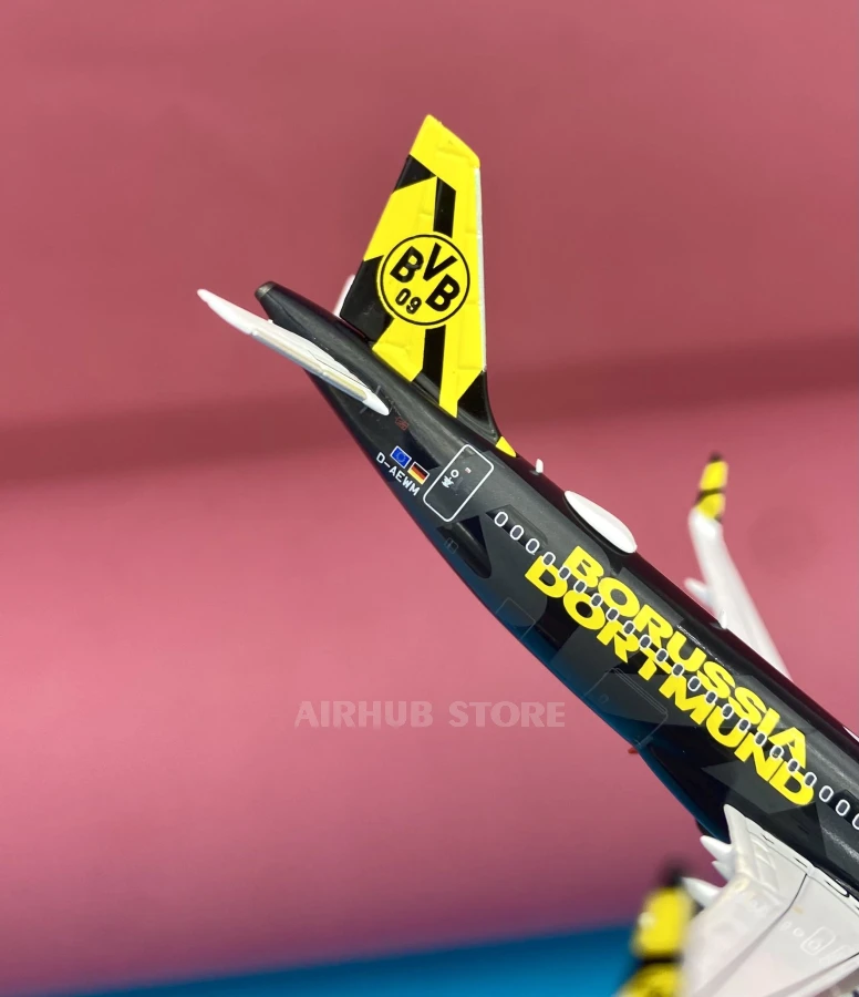 The prototype for this miniature is a real aircraft with registration number D-AEWM, which flies in the Eurowings fleet and has been given a special livery dedicated to Borussia Dortmund football club. This aircraft is instantly recognizable at the airport and often attracts the attention of spotters.