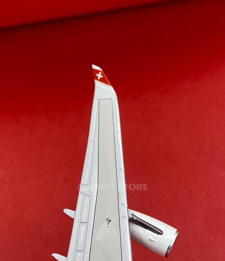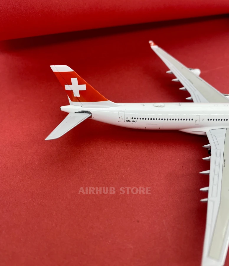 The model accurately reproduces the shape of the fuselage, four engines, swept wings, and signature SWISS design elements. It looks impressive both in a collector's display case and on a desk, reminding us of the beauty of long-distance flights.