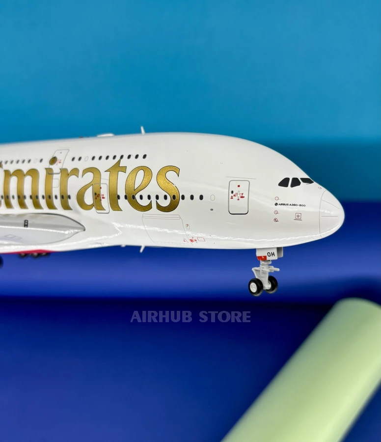 The Airbus A380-800 Emirates (registration number A6-EOH) is a 1:200 scale model by GeminiJets that reproduces one of the most famous flagships in the Emirates fleet. The model is made of die-cast metal with extraordinary detail and is decorated in the new Emirates livery, presented in 2023.