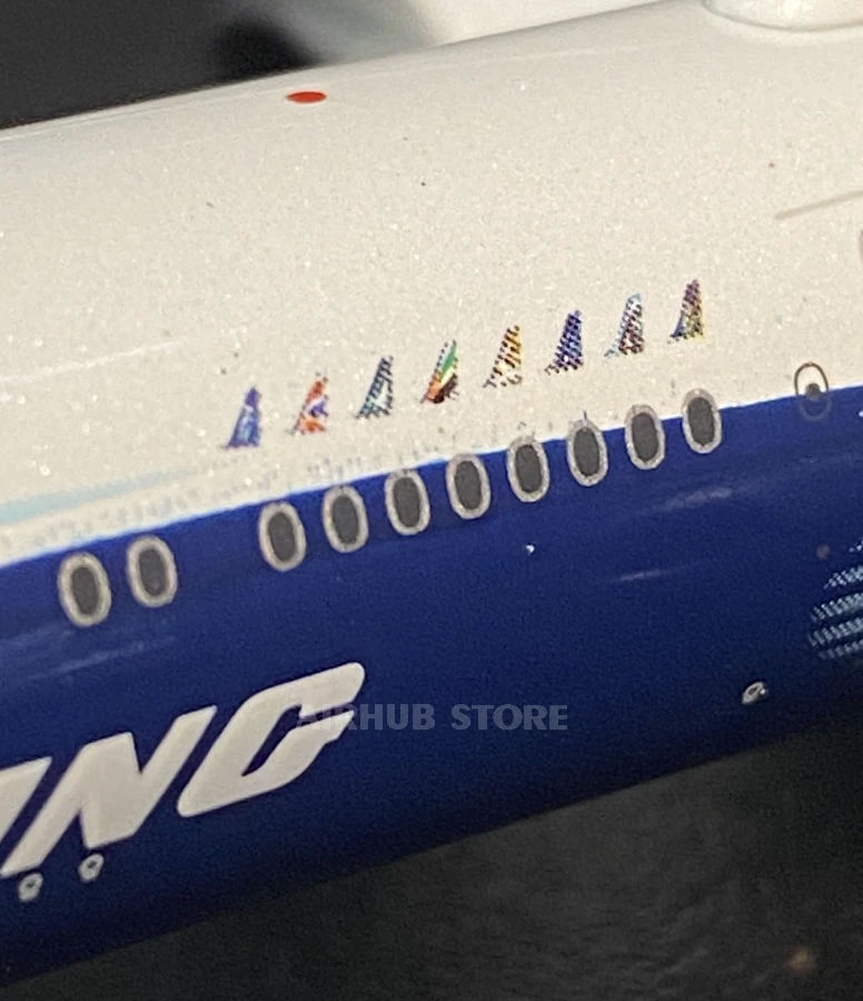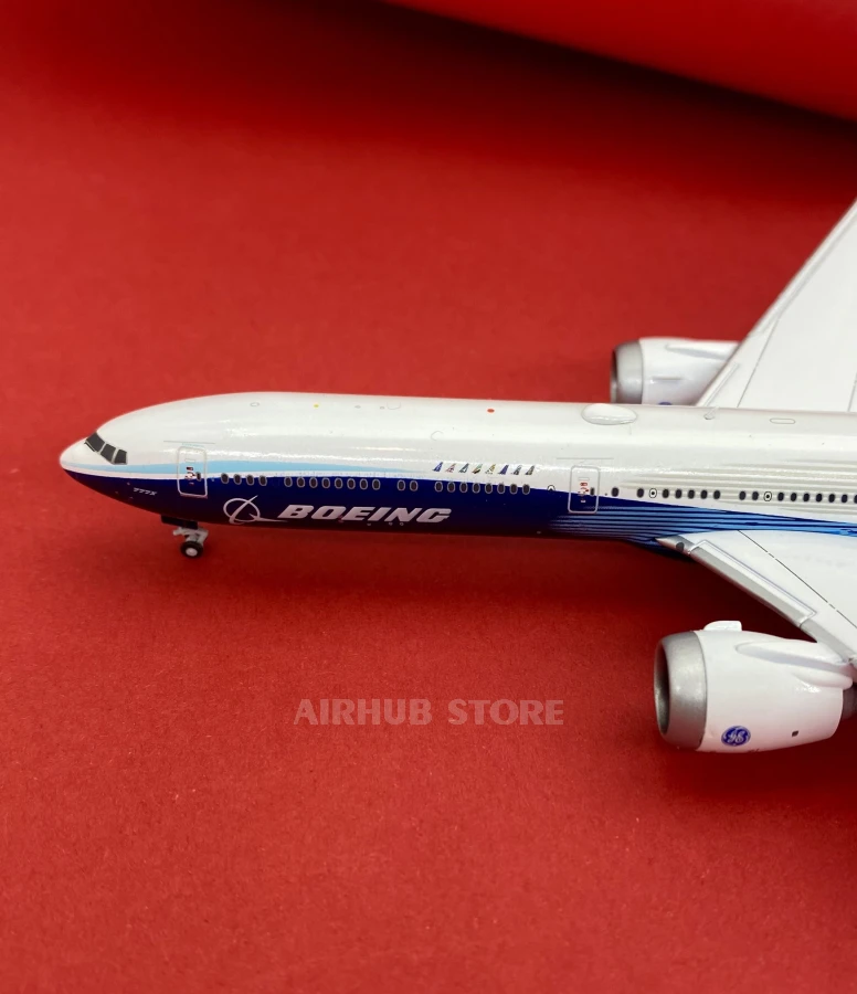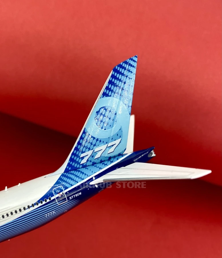 The Boeing 777-9X is a new generation of flagship long-haul airliner that combines innovation, increased capacity, and improved flight efficiency. The 1:400 scale model shows the recognizable features of the aircraft: an elongated fuselage, new wings, distinctive test livery, and N779XW registration.