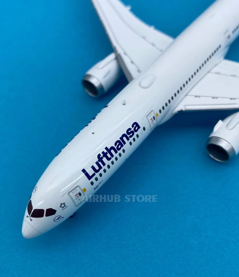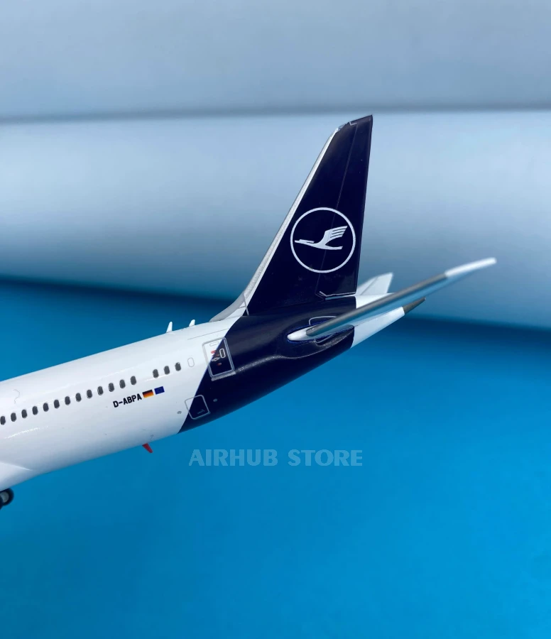 On a scale of 1:400, this airliner looks as elegant as it does in the real sky: an elongated fuselage, smooth wing lines, neat engines, and an updated Lufthansa livery with a deep blue tail. The white and blue design gives the model a clean and minimalist look, which is exactly how Lufthansa has presented itself in recent years.