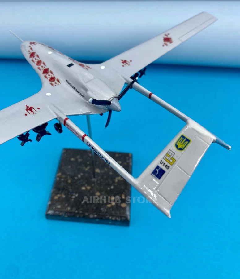 The model conveys the recognizable features of the TB2: a thin straight wing, a tail boom with two beams, an upper engine location, and underwing weapons. The unique color scheme with ornamentation emphasizes the Ukrainian identity of the drone, which has become a true symbol of struggle.