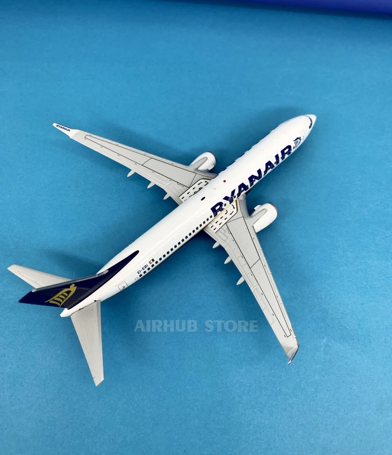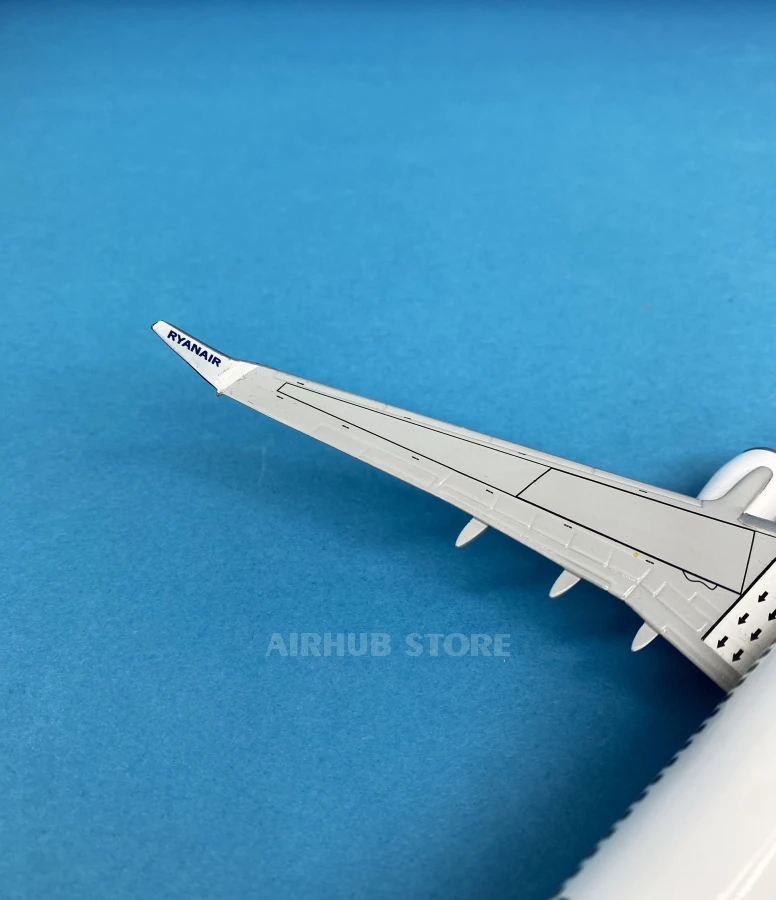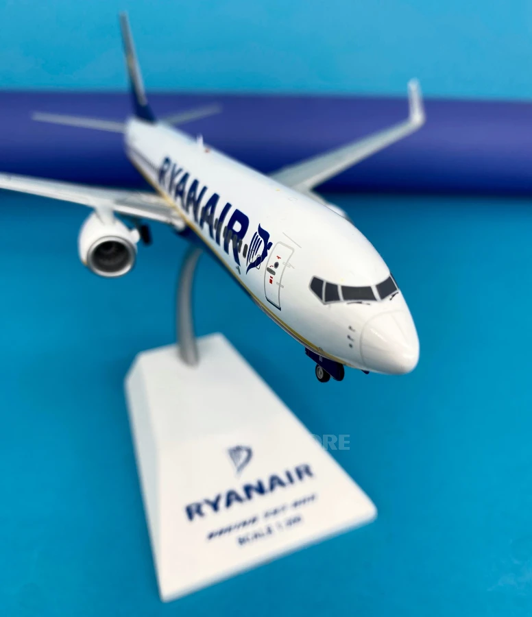 The Boeing 737-800 is one of the most popular aircraft in the fleet of Ryanair, a well-known low-cost airline. This 1:200 scale metal model accurately reproduces the characteristic lines and livery of the real aircraft: with the Ryanair logo on the fuselage, blue keel, and white body.