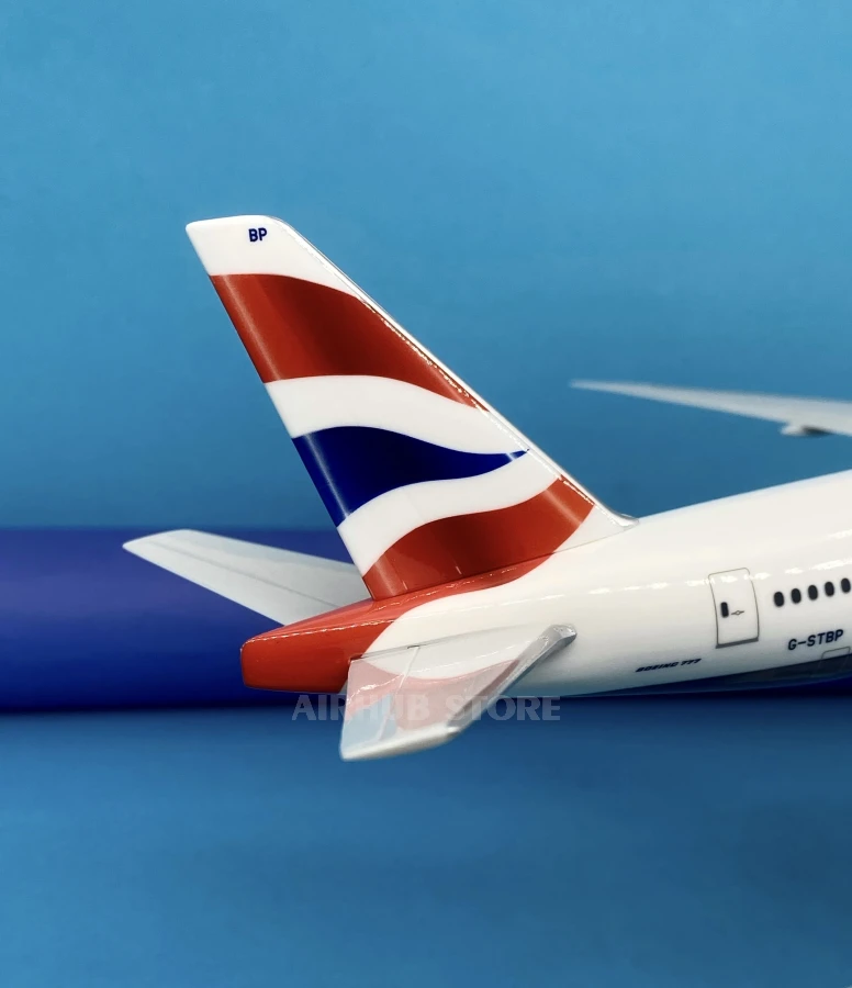 The 1:200 scale model of the Boeing 777-300ER reproduces the real airliner in British Airways livery. The registration number G-STBP is printed on the fuselage, corresponding to the real aircraft of the airline.