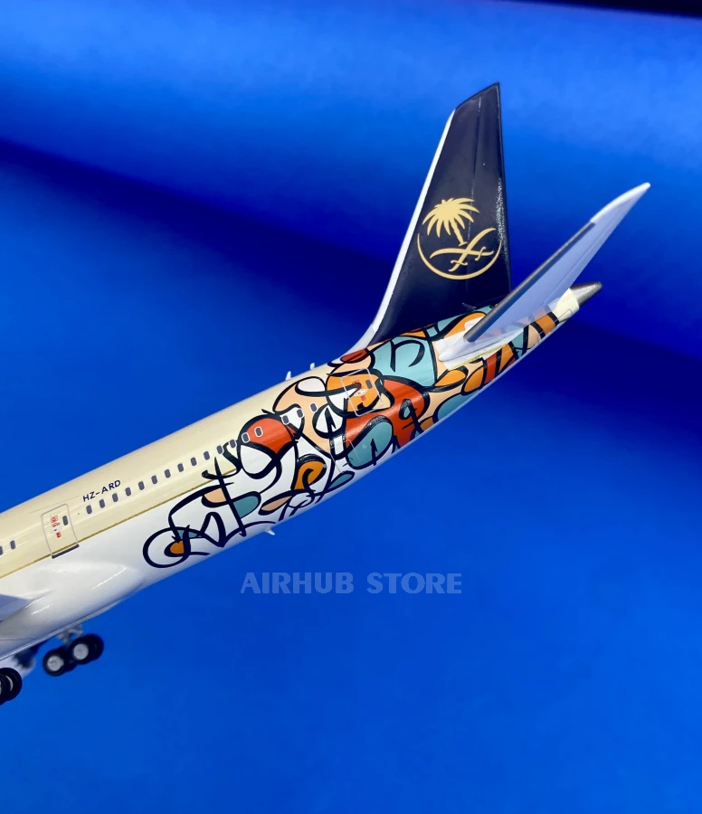 This is a collectible model of one of the most technologically advanced passenger aircraft in the fleet of Saudi Arabia's national carrier. A distinctive feature of this particular aircraft is its bright special livery with an artistic element on the tail section of the fuselage, which gives the aircraft a distinctive and unusual appearance among standard paint schemes.