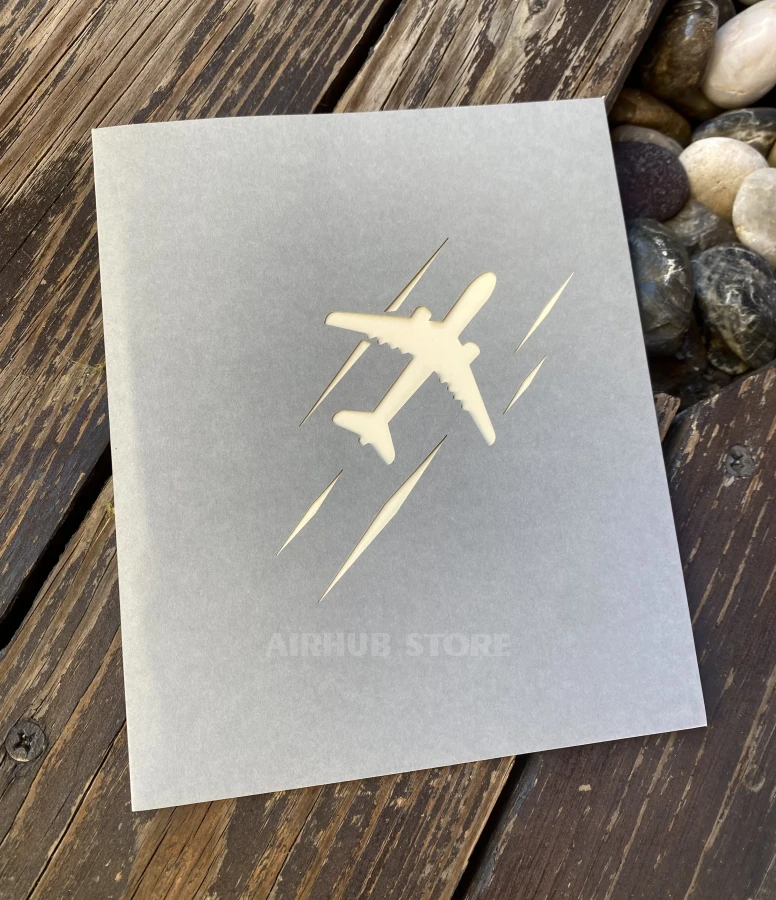 This voluminous 3D card combines classic style and modern design. On the outside, it looks like an elegant card with an airplane-shaped cutout, but inside it hides a surprise: a detailed three-dimensional model of a passenger airliner unfolds.