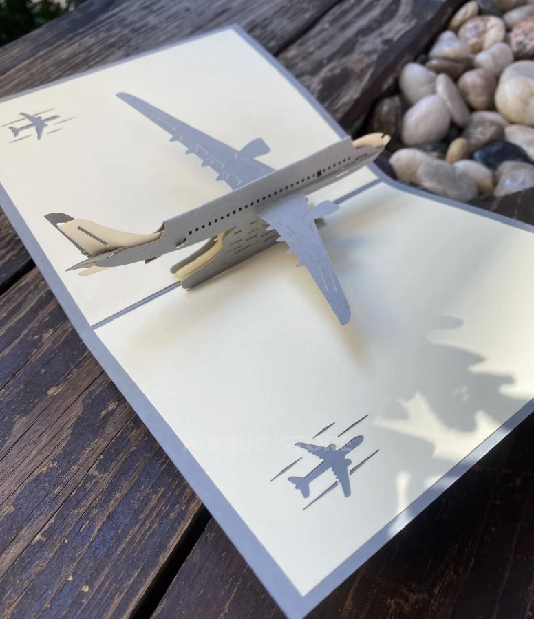 A 3D card with an airplane that unfolds into a three-dimensional model. A spectacular and stylish gift for aviation enthusiasts.