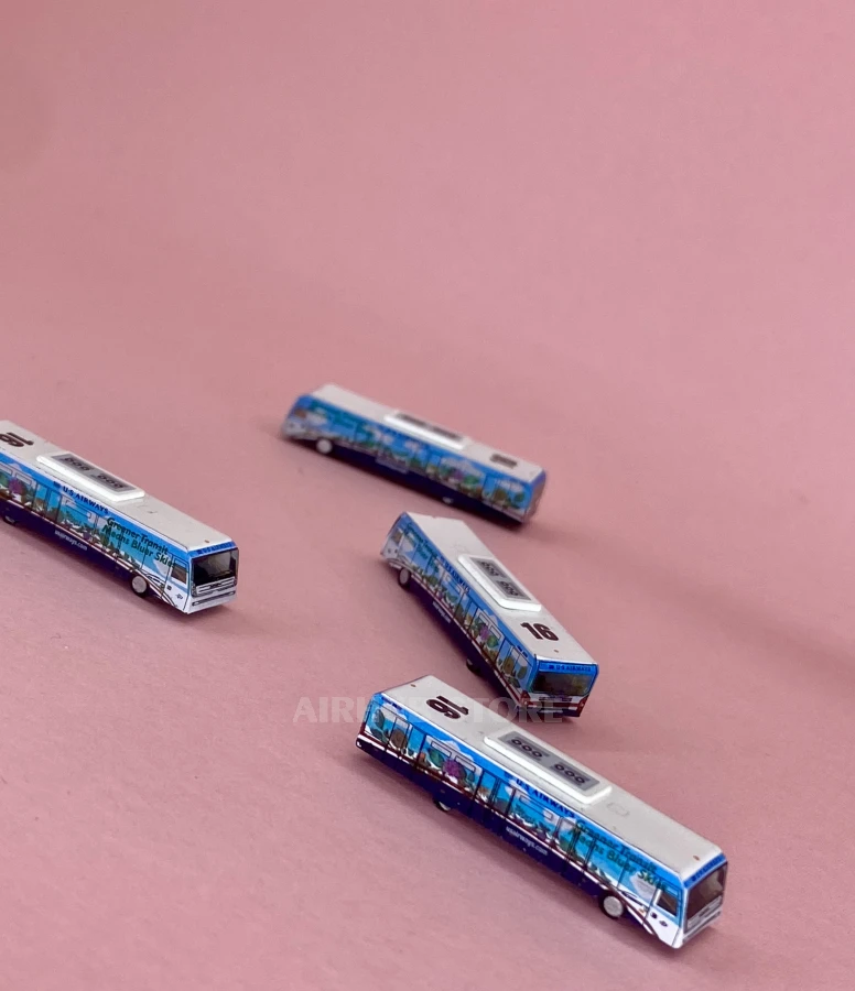 Airport buses are an integral part of any airport, and now you can add them to your collection. This set includes 4 bus models in 1:400 scale. Each has a unique print on the sides, clear body lines, and realistic proportions.