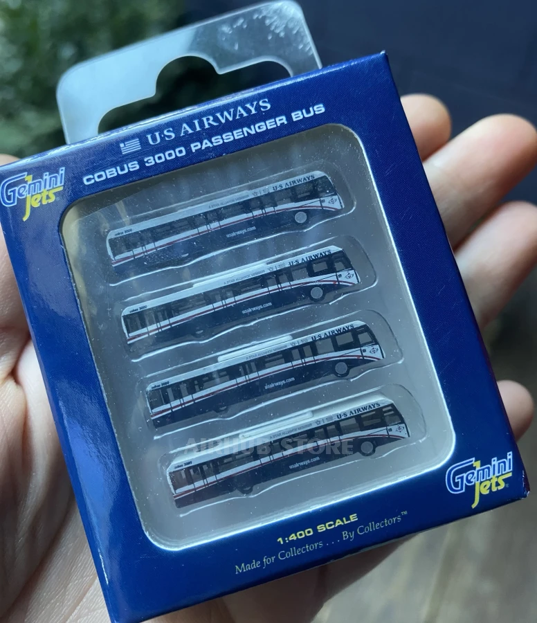Cobus 3000 airport buses are a true symbol of ground handling at international airports. This set from Gemini Jets features 4 miniature buses in the corporate colors of U.S. Airways.