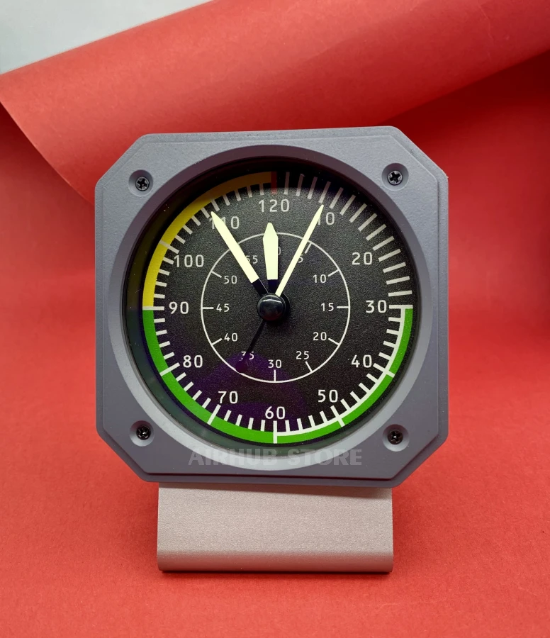 The clock is styled after an aviation flight speed control device, with a characteristic circular scale and colored sectors reminiscent of real indicators in an aircraft cockpit. The design looks technical and restrained, with an emphasis on functional graphics. The clock is mounted on a separate stand that fixes it at a comfortable viewing angle. This solution makes it visually similar to a panel instrument adapted for desktop use.