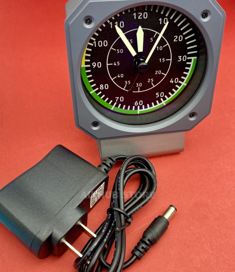 The set includes a power adapter: when connected to a power outlet, the dial backlight is activated, making the scale and markings easy to read in the dark. Additionally, the hands have a light-accumulating coating - after being exposed to light, they glow on their own even without the backlight turned on. This clock is for those who appreciate aviation instruments, technical aesthetics, and the atmosphere of a real aircraft cockpit. It fits well in an office, home study, or aviation collection.