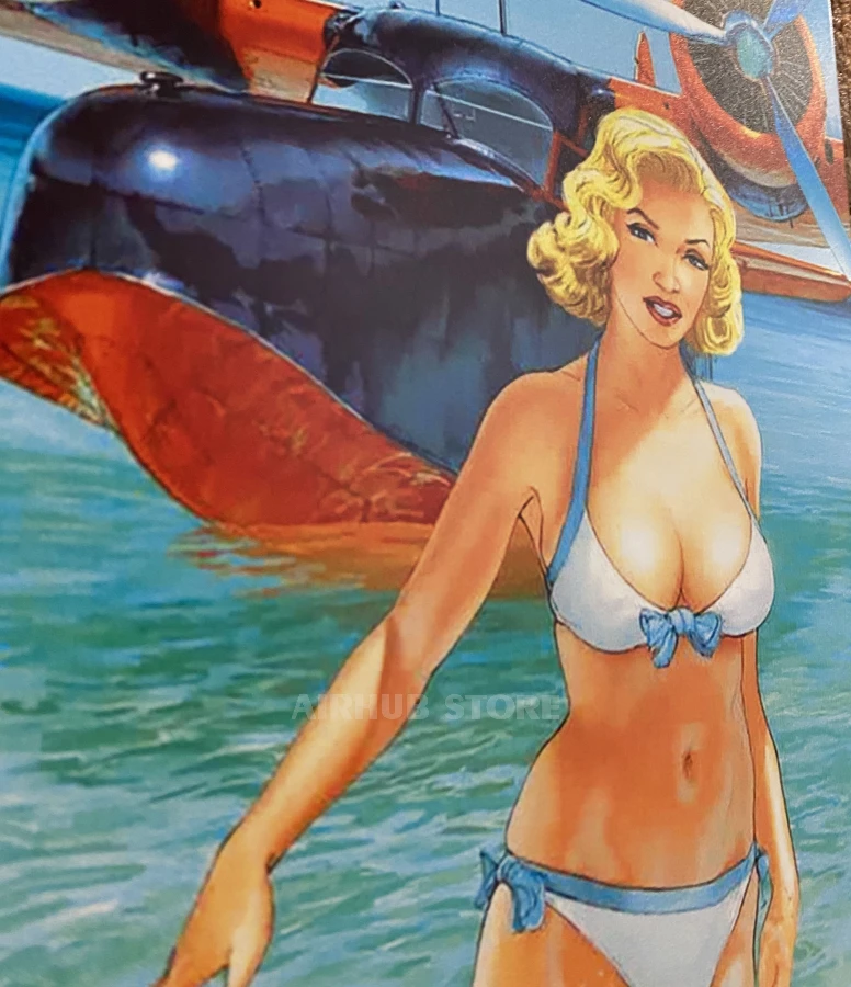 This poster is not only a decorative element but also a reference to the golden age of aviation and pin-up culture. It creates an atmosphere of lightness, adventure, and sunny travels in the style of the 50s and 60s.