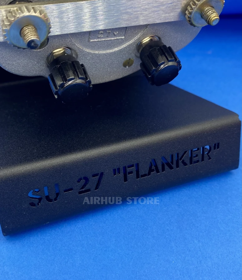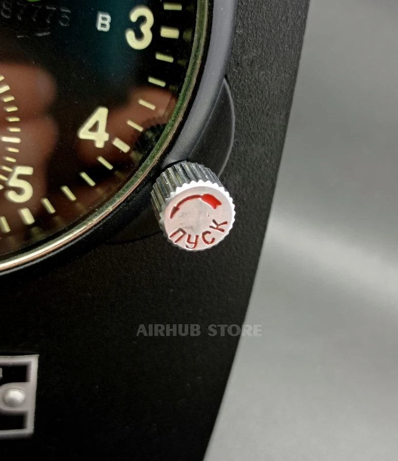 At the top of the stand is a silhouette of an aircraft, at the bottom is a stylized metal plate with a detailed description (the description indicates: type, serial number). There are two inscriptions: "Chelyabinsk Watch Factory" and "Molniya". Please note that each plate is made according to factory standards and is also an original part of the device. The inscriptions are made according to GOST 26.008-85 (applicable only in aviation).