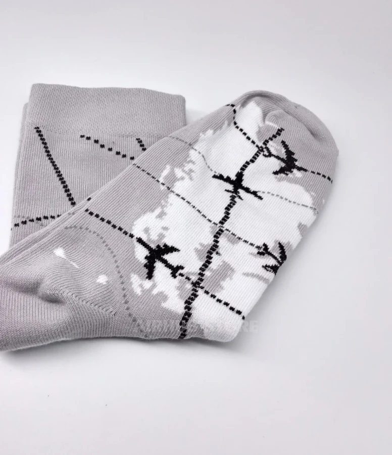 Beige socks with airplanes are a stylish and comfortable accessory for aviation fans. Made of soft and comfortable material, they are ideal for everyday wear, traveling or as a gift for a pilot or airplane fan.