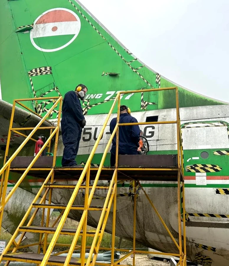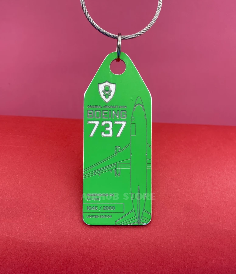 The keychain is made from the actual skin of a Boeing 737-200 with registration number 5U-BAG, an aircraft that served as the official presidential aircraft of the Republic of Niger for over three decades. Delivered in 1978, it carried presidents, diplomats, and state delegations around the world — from African airfields to European capitals, including flights to London.