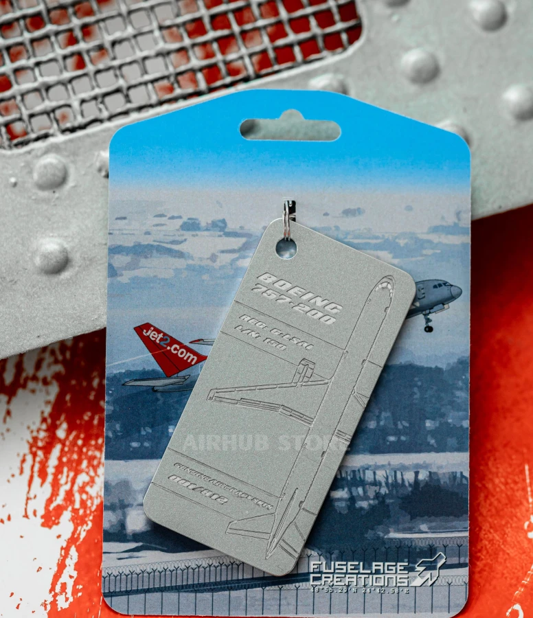 This aviation keychain is made from a fragment of the fuselage of the Boeing 757-200 G-LSAI, a true legend of the sky. The aircraft first flew in 1987 as B-2803 under the Chinese CAAC, and in 1988 it became part of China Southern Airlines. In 2006, the aircraft was acquired by the British carrier Jet2.com and received G-LSAI registration.