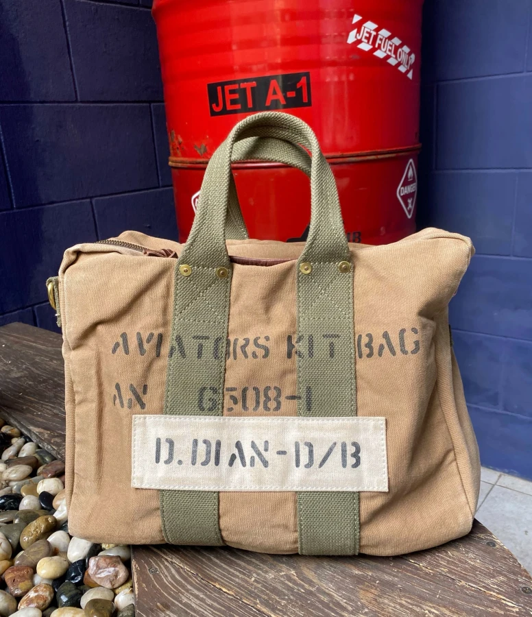 The Aviator's Kit Bag is the true embodiment of authentic military design, inspired by the equipment of World War II pilots. Made of durable canvas with genuine leather accents, it has a recognizable look with stenciled lettering that once adorned real US pilot bags.