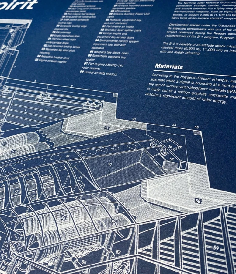 Poster with drawing of Boeing 737-400 airplane, the dark blue poster shows the layout diagram of this airplane. This poster will make a great gift for someone who is interested in airplanes and fond of Boeing.
