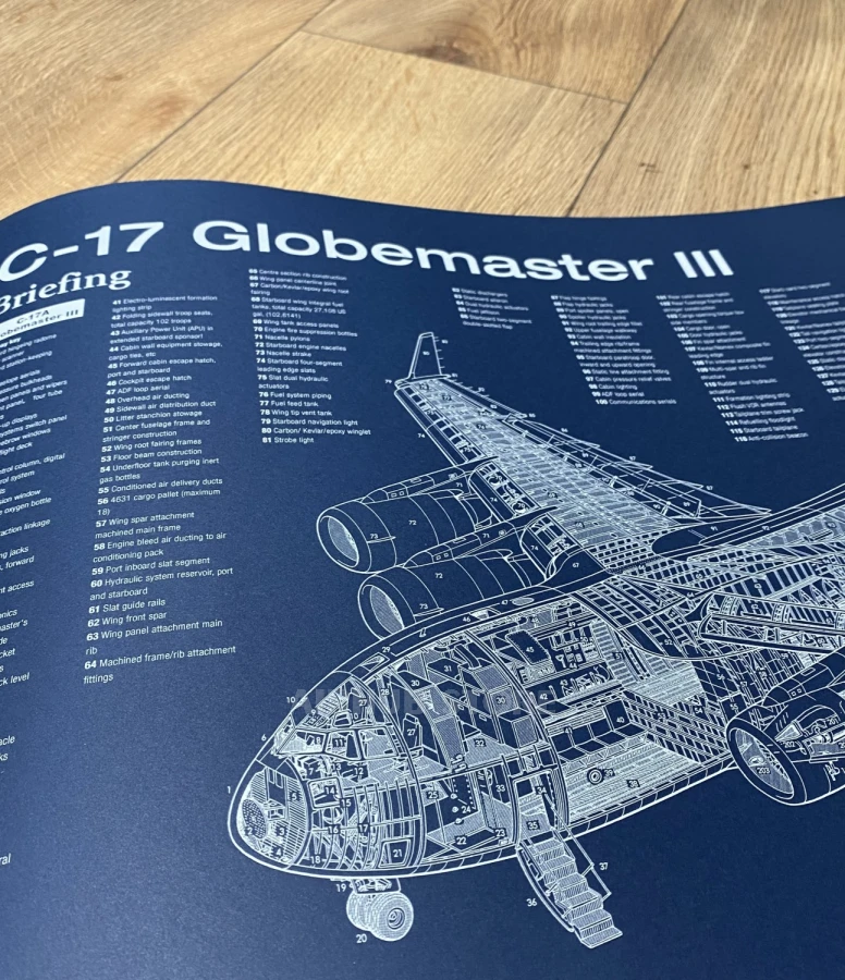 Poster with drawing of C-17 Globemaster airplane, the dark blue poster shows the layout diagram of this airplane. All elements are numbered and described around the image, where a transcription with description is indicated. The poster itself is printed on heavy blue paper, measuring 61 cm by 33 cm.