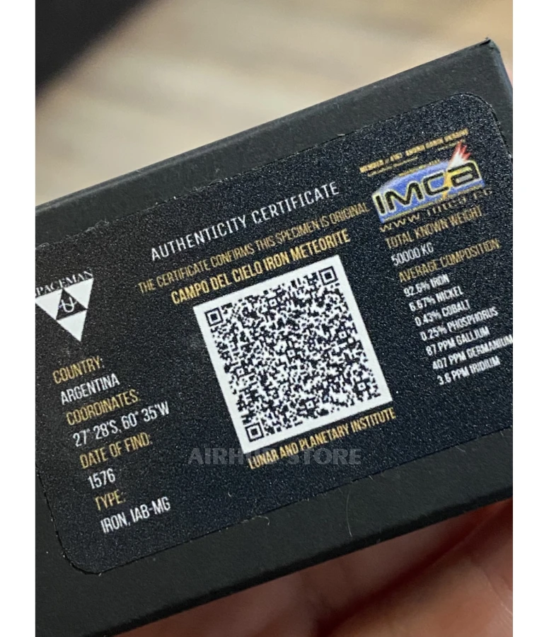 The authenticity of the meteorite is confirmed by a certificate from the Ukrainian company SPACEMAN, which is a member of the organization https://imca.cc under registration number 4167. IMCA is the most respected organization in the world of meteorites. SPACEMAN is also a member of The meteoritical society and the Global Meteorite Association and is the only representative of these organizations in Ukraine.
