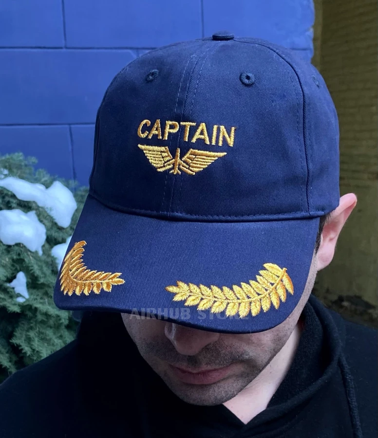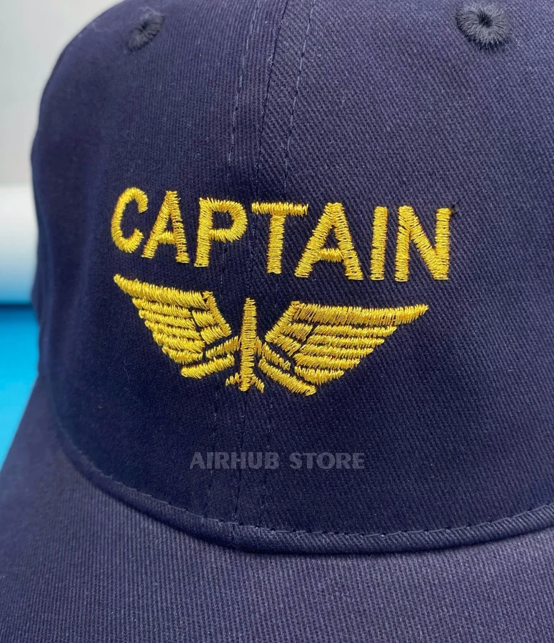 This cap was created with a distinct aviation theme and references to the iconic image of an aircraft commander. The embroidered Captain lettering, wings, and gold elements on the visor create a recognizable pilot aesthetic associated with experience, responsibility, and authority in the cockpit.