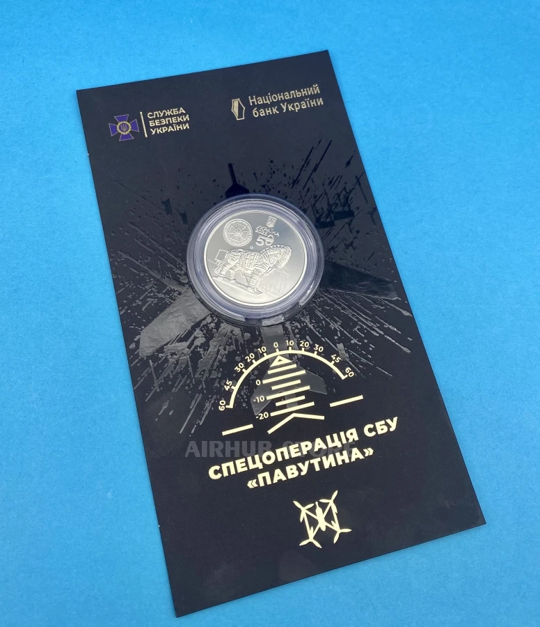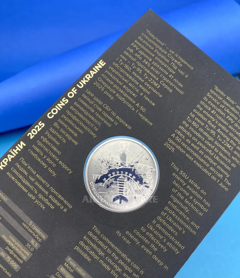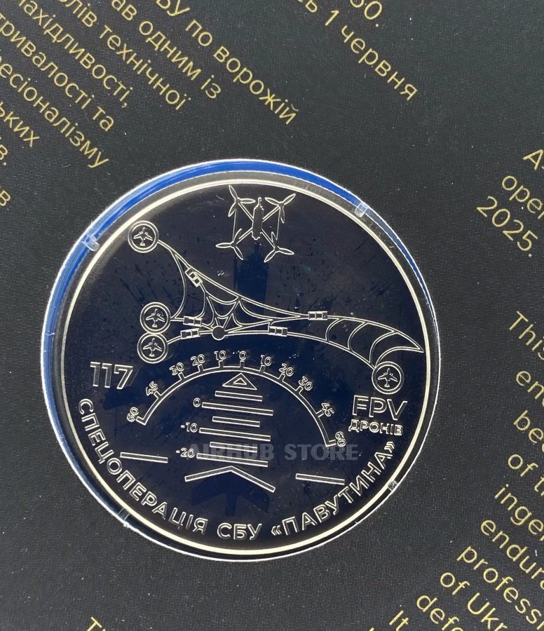 This commemorative coin is dedicated to the activities of the Security Service of Ukraine (hereinafter referred to as the SBU) and its unique special operation “Pavutina”, which is an important component of our state's national security system. The operation lasted about a year and a half and ended on June 1, 2025, with a massive attack by 117 FPV drones on four enemy military airfields. As a result of the strike, 41 Russian strategic aircraft were destroyed. This result demonstrated Ukraine's ability to carry out high-tech operations at a great distance, confirming the endurance, professionalism, and intellectual power of Ukrainian defenders. The commemorative coin honors the heroism, ingenuity, and technological mastery of the SBU servicemen, who, in the face of Russia's full-scale aggression against Ukraine, demonstrate an unmatched ability to defend the sovereignty and territorial integrity of the state.