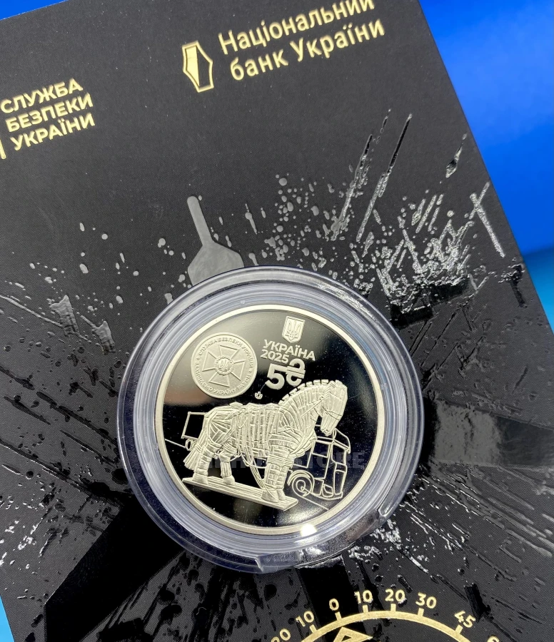 The obverse of the coin features a stylized image of the Trojan horse in the center of the composition, behind which the silhouette of a truck transporting FPV drones to combat positions can be seen. This archetype, inspired by the ancient Greek legend of ingenuity, reflects the essence of Operation Spiderweb—the victory of intellect and creativity over brute force. The upper part of the coin features the small State Emblem of Ukraine, the inscription UKRAINE, the year of minting 2025, and the denomination 5 with the graphic symbol of the hryvnia. Below is the logo of the Banknote and Coin Mint of the National Bank of Ukraine. On the left is the emblem of the Security Service of Ukraine with the slogan “SECURITY SERVICE OF UKRAINE. WE PROTECT UKRAINE TOGETHER.”