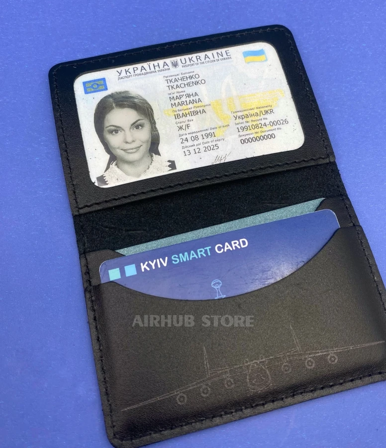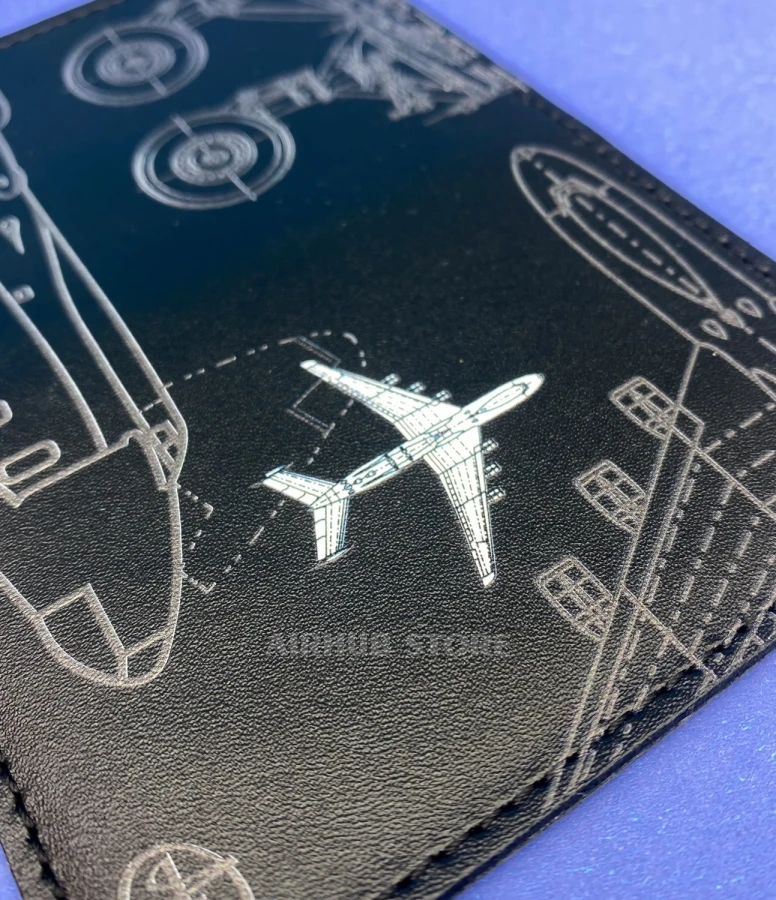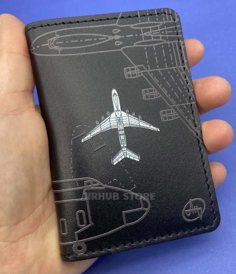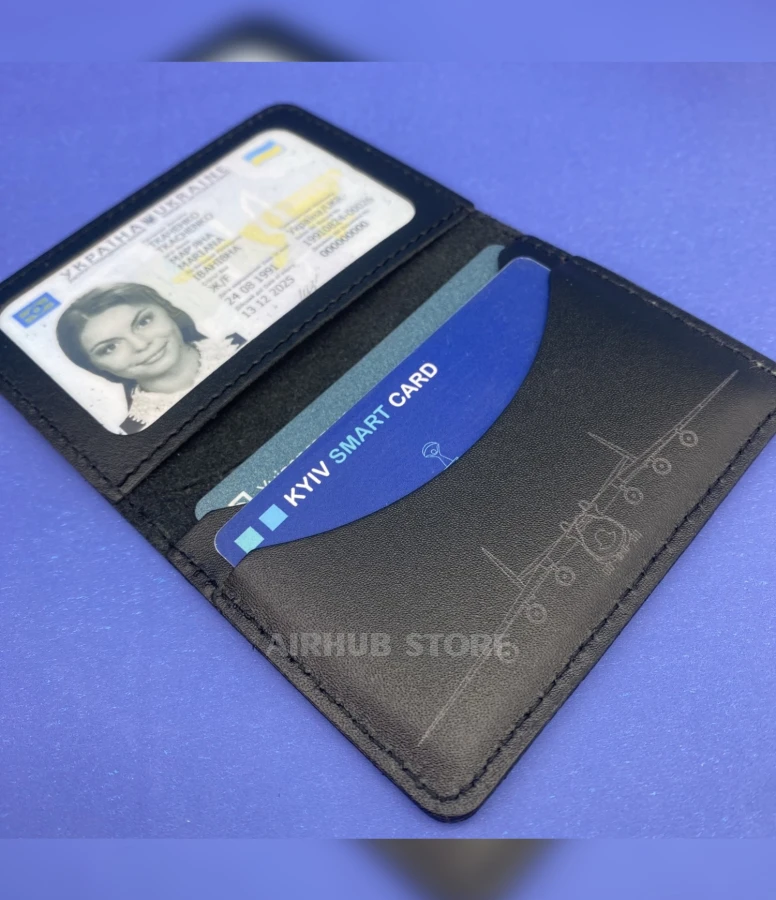 Two compartments for cards, a transparent compartment for ID passport, ID card, etc. For any card of standard approved size. Stylish leather cover for ID cards and bank cards with a unique aviation design.