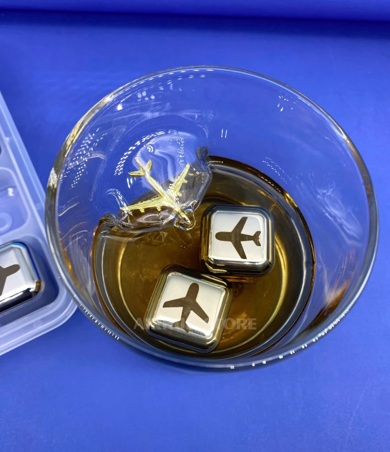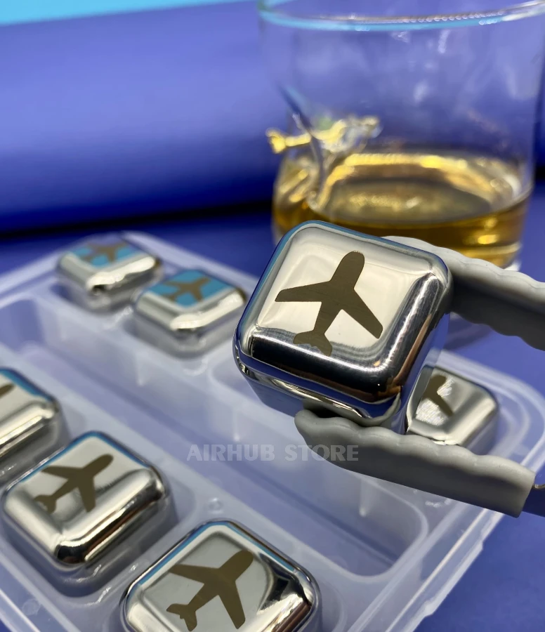 This set of eight metal cooling cubes decorated with an airplane engraving is a stylish alternative to ice that keeps drinks cold without dilution. The cubes are made of food-grade stainless steel, freeze quickly and keep their temperature for a long time. The set also includes handy tongs and a transparent organizer for freezer storage.