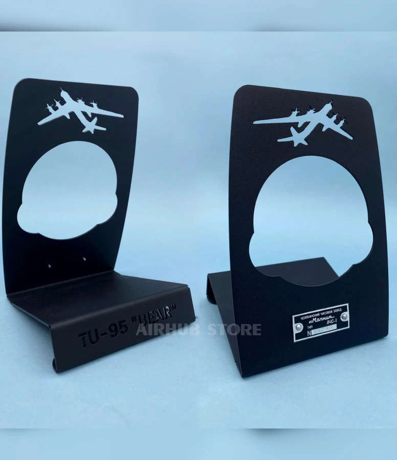 The top features a cutout silhouette of an aircraft: ranging from MiG-29 or Su-27 fighters to transport planes or helicopters. On the bottom is a plaque with technical information, adding the feel of genuine aviation equipment. On the back is the aircraft’s name according to NATO classification.