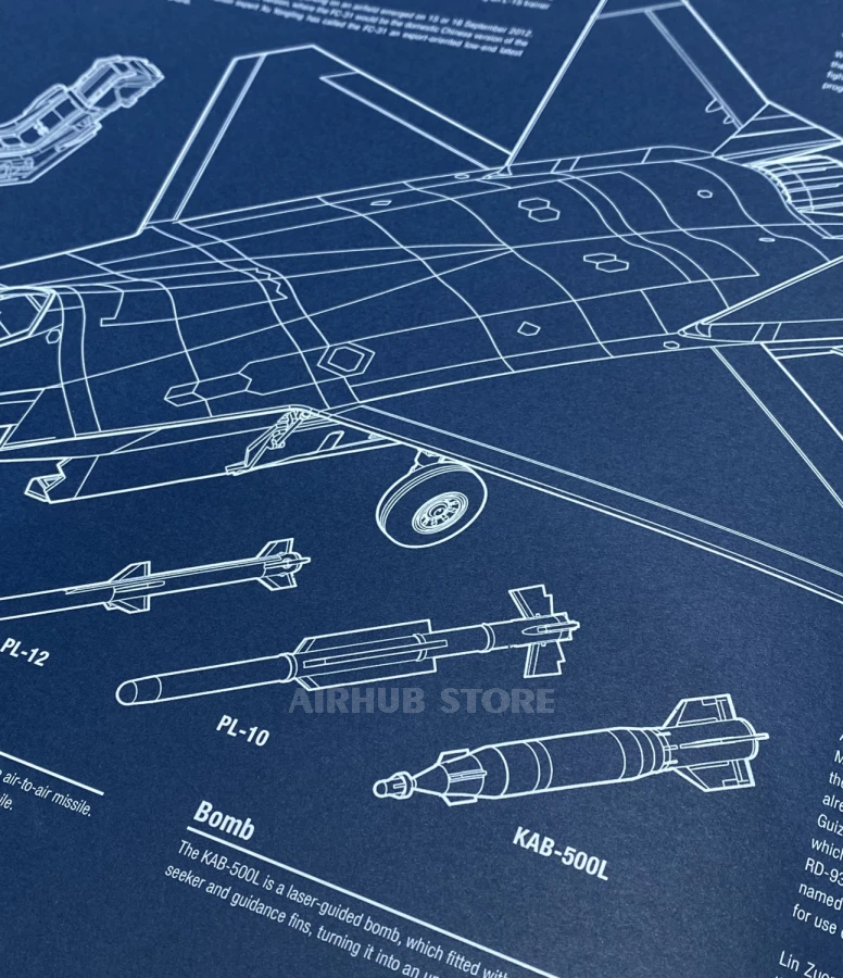 Poster with drawing of FC-31 Gyrfalcon aircraft, the dark blue poster shows the features of this fighter aircraft. The poster is printed on heavy blue colored paper, measuring 61 cm by 33 cm.