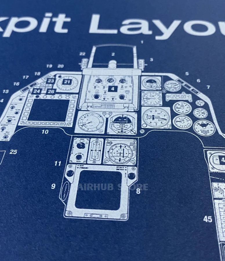 A poster with a drawing of the cockpit of an airplane, a dark blue poster shows a layout diagram. All the elements are numbered and described around the image, with a decoding and description. The poster itself is printed on thick blue paper, measuring 36 cm by 33 cm.