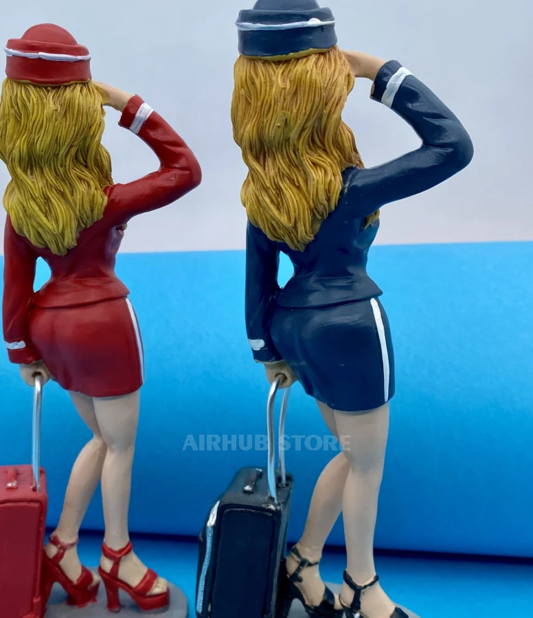 Figures of charismatic stewardesses in red and blue uniforms are a stylish and cheerful aviation souvenir. Each of them is holding a suitcase, posing with a smile and giving a humorous greeting as if she had just met passengers at the gate.