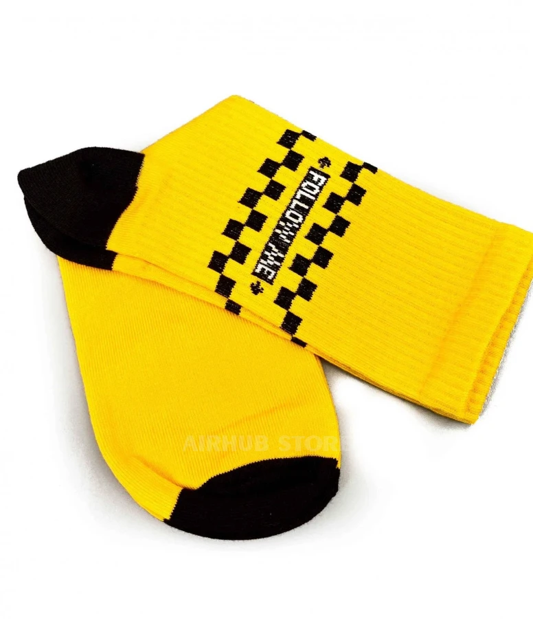 The bright yellow socks with the FOLLOW ME inscription are inspired by the runway escort vehicles.