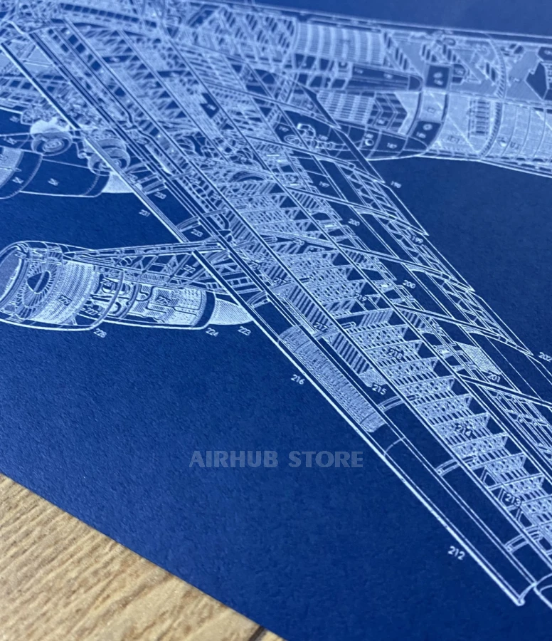 Poster with drawing of Boeing 737-400 airplane, the dark blue poster shows the layout diagram of this airplane. This poster will make a great gift for someone who is interested in airplanes and fond of Boeing.