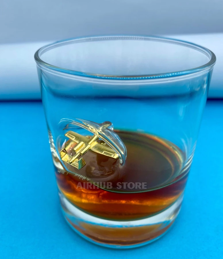 In this glass, a metal miniature of the aircraft is integrated into the glass in such a way that the fighter seems to cut through the drink. Thanks to the transparent glass, the perception of depth changes, and the effect itself looks different depending on the color and level of the liquid.