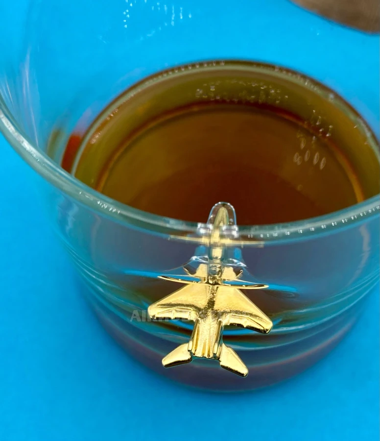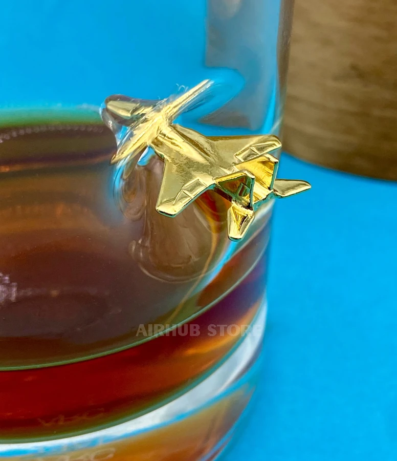 A fighter jet figurine is integrated into the transparent glass, making it look as if the aircraft is passing through the thickness of the drink. The visual effect changes depending on the liquid level and lighting, creating additional depth and a sense of movement. The thick glass ensures comfortable use and stability on the surface.