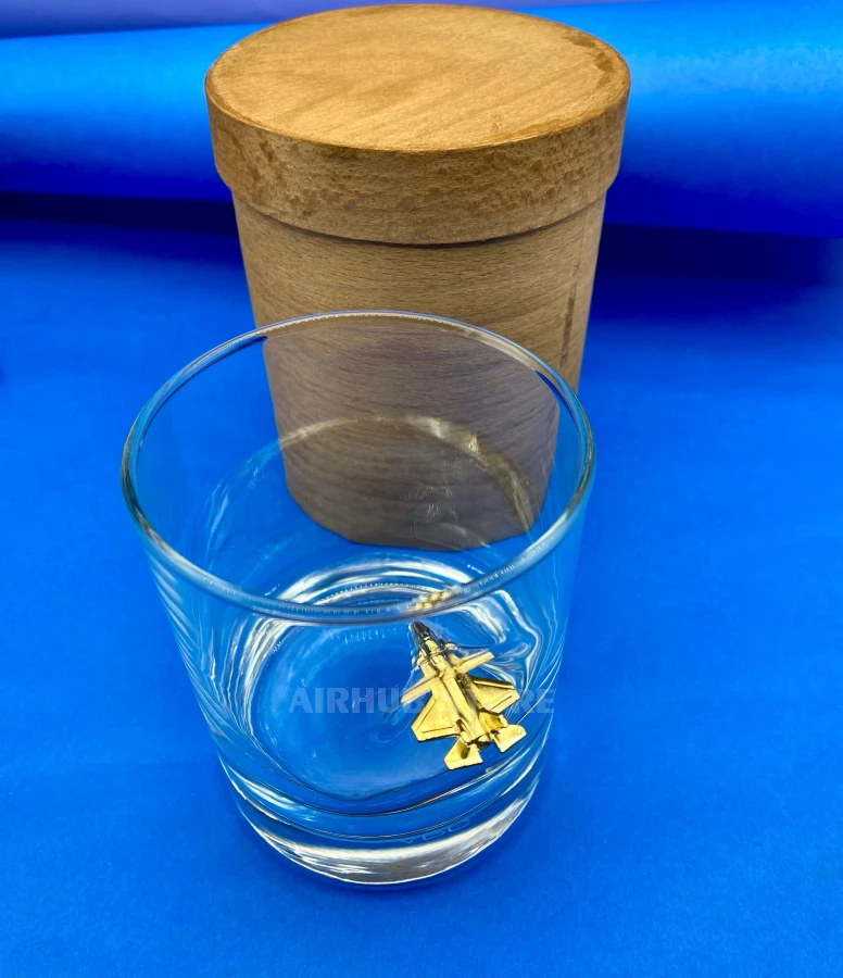 The design of this glass is based on the effect of movement. The metal F-35 Lightning II fighter jet is attached to the inner wall of the glass in such a way that it looks as if the plane is flying right into the glass.