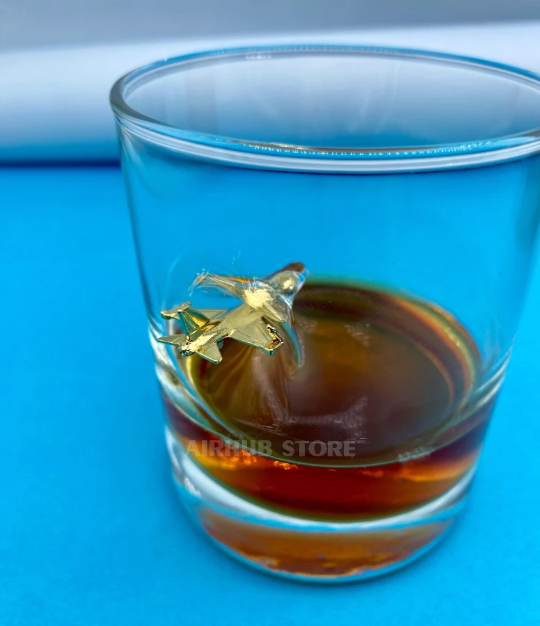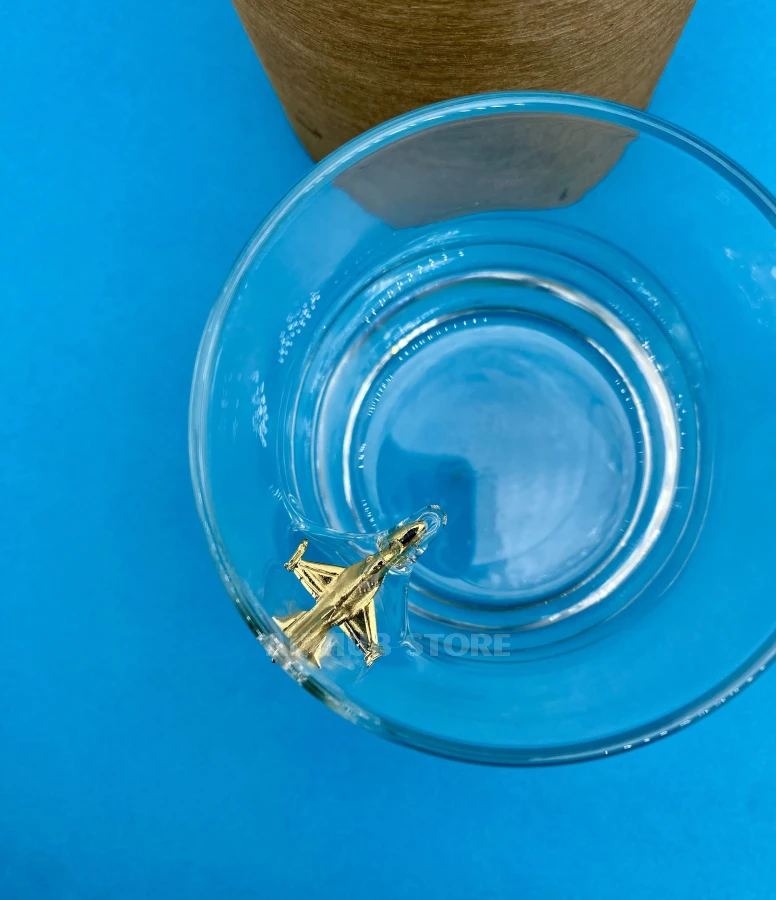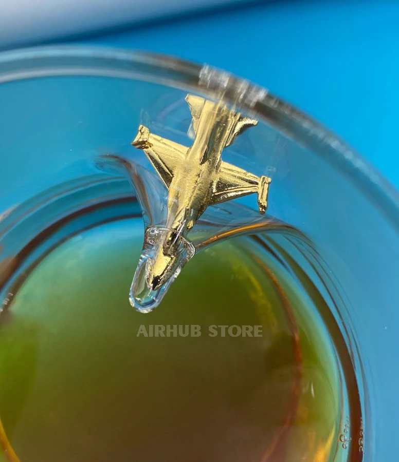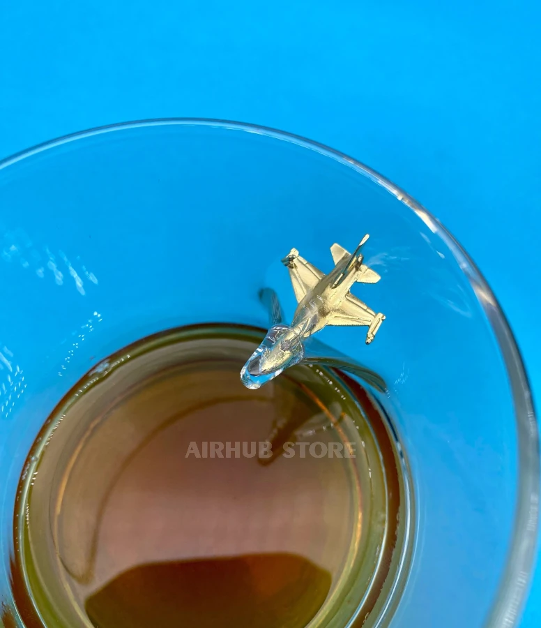 The F-16 Fighting Falcon looks like it's flying through the sky right in the middle of your glass.